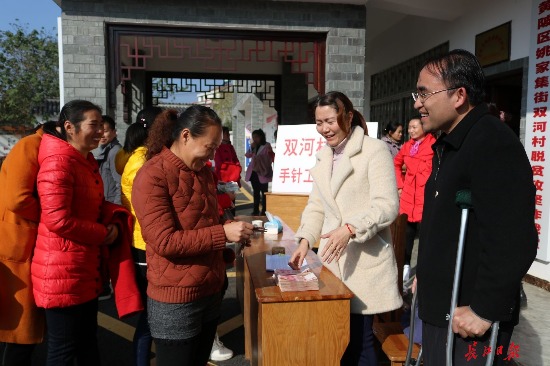 长江日报讯(见习记者胡雷 记者王晶)11月20日,武汉市黄陂区姚家集街双河村村委会门口,55名留守妇女欣喜地领到了本月打工的工资,现场共计发放5万多元。