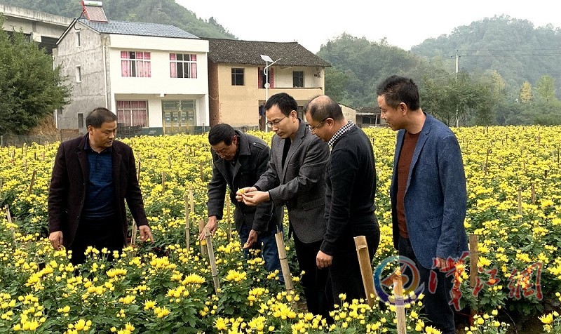 10月23日,该镇镇委、镇政府班子成员深入垭子口村金丝皇菊基地查看相关情况,并帮助群众研究分析市场销售形势。通讯员周艺斐 摄