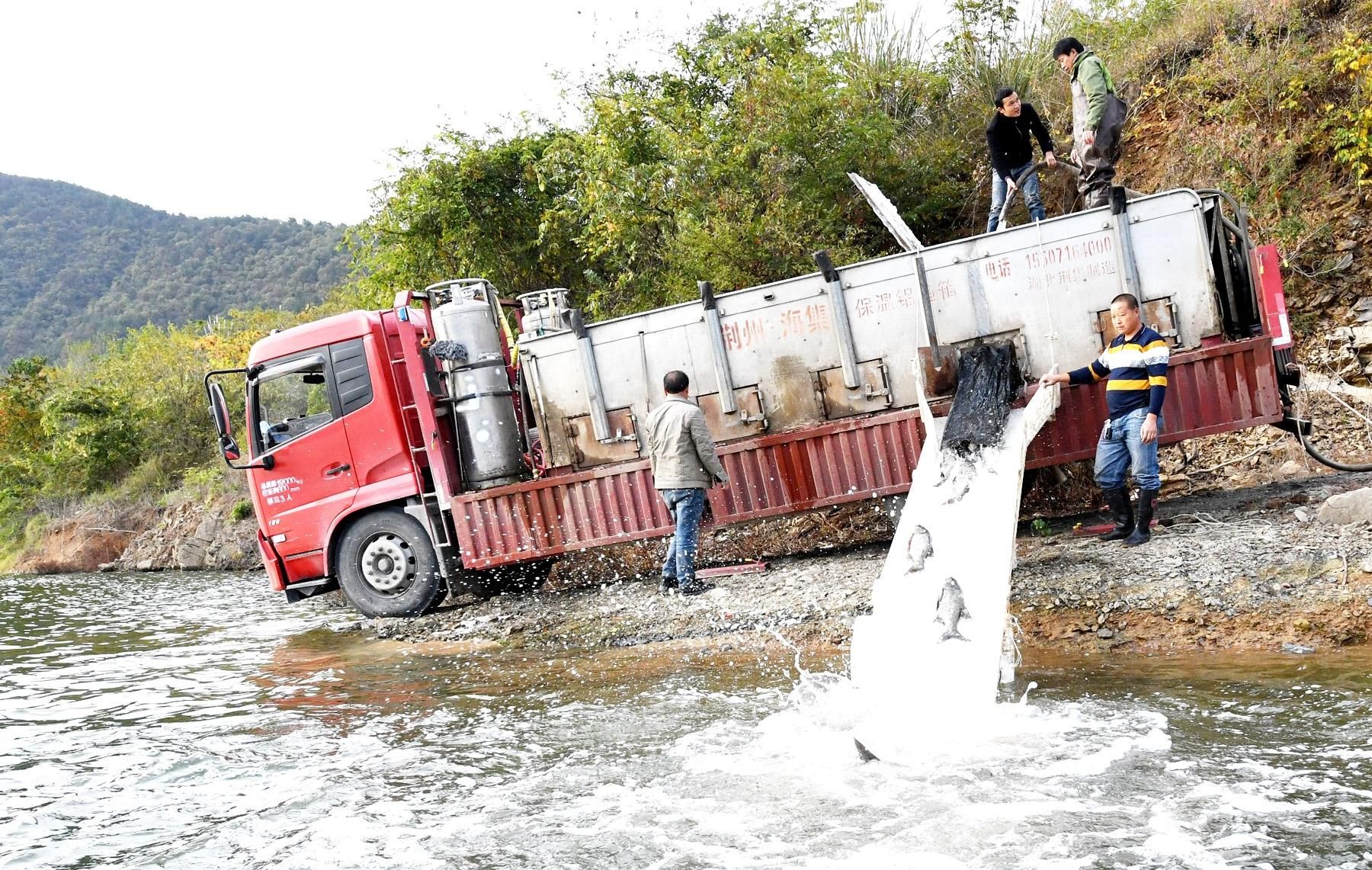 近日,保康县南河渔业合作社社员在寺坪库区投放成鱼。今年,该合作社筹资700多万元,购买花白鲢、鳙鱼等3斤以上的成鱼30多万尾,投放到库区屯养,以促进寺坪库区生态平衡,为明年捕捞打好基础。(农村新报通讯员 陈泉霖 摄)