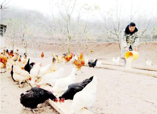 十堰市郧阳区安阳镇陈营村王金霞创办的“丈母娘家庭农场”里,70岁的工人王玉鹏正在喂鸡。该农场每年养鸡5000多只,年均收入达19万多元。目前,该区鸡存笼总量达422.48万只,带动全区3000多贫困人口实现脱贫。