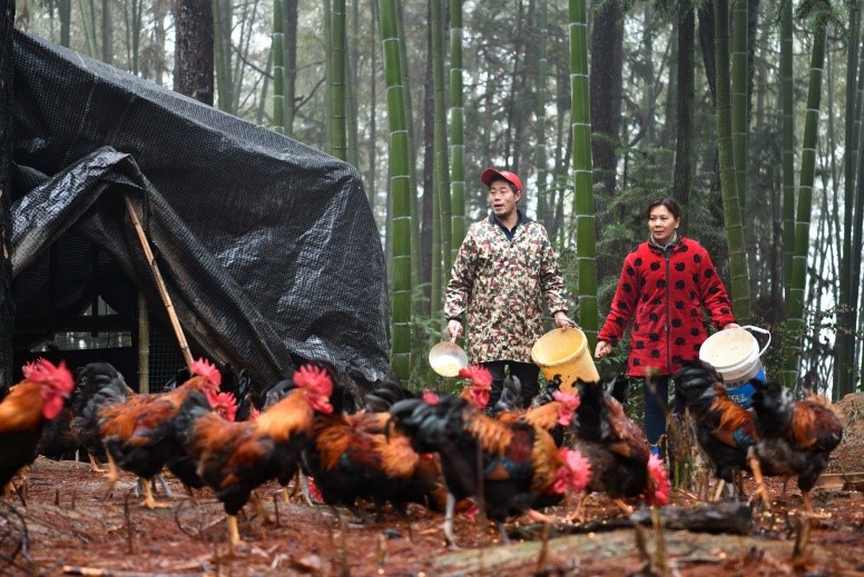 “喔喔喔”冬日晨雾中,公鸡在坪头岭竹林中扑打着翅膀。2020年1月11日,通城县塘湖镇狮子村贫困户张亮甫吹着口哨将玉米和着细糠抛向鸡群,一千多只鸡吃得正欢。