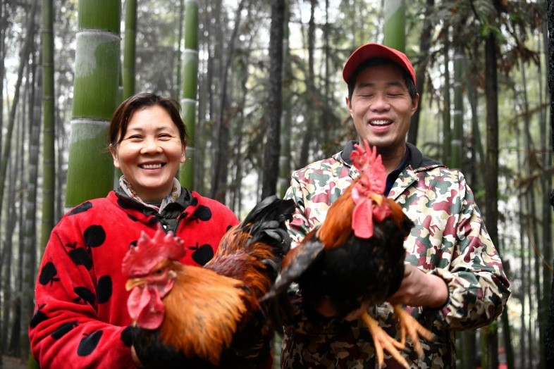 2020年1月11日,湖北省通城县塘湖镇贫困户张亮甫夫妻展示饲养的土公鸡。