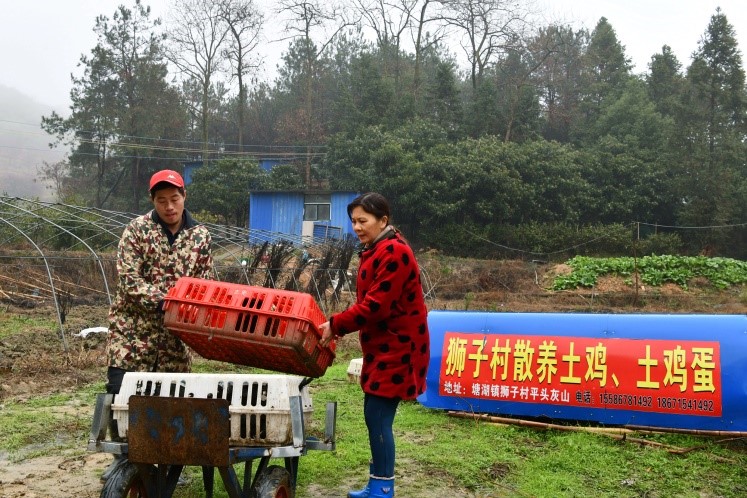 2020年1月11日,湖北省通城县塘湖镇贫困户张亮甫夫妻俩搬运土鸡准备出售。