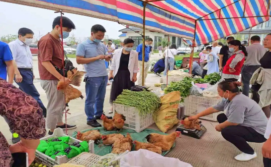 荆楚扶贫网消息(通讯员 叶小博)“老板,我要一盒土鸡蛋。”“大姐,帮我称点茄子。”“大哥,你这个土鸡怎么卖的啊,多少钱一斤啊……”6月19日,荆州区弥市镇太平桥村和改口村村部门前热闹非凡,前来买卖交易农产品的人们占满了整个村部广场。