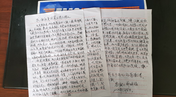 图为:郑明福老人的感谢信