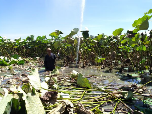 “李老板,我要的1000斤菜藕准备好了吗?”云梦客商问。李永发手指前方,4条挖藕枪如4条矫健的蛟龙,喷着白花花的清水,水柱到处,一枝枝白生生的莲藕浮出水面,整藕、装筐、上车、付款……客商们满意而归。
