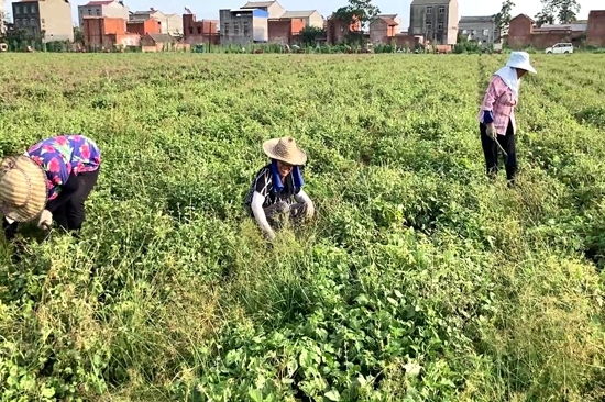 近日,在湖北思宝农业科技有限公司丹参种植基地,50多名村民正在地里锄草,附近的金银花种植基地已经采摘了三茬。为打造种植业升级版,该镇着力发展壮大中草药产业,目前已完成2500亩的丹参、金银花、芡实种植,中药材加工基地建设正在稳步推进。许多村民通过土地流转,在基地打工获得一份不错收入。