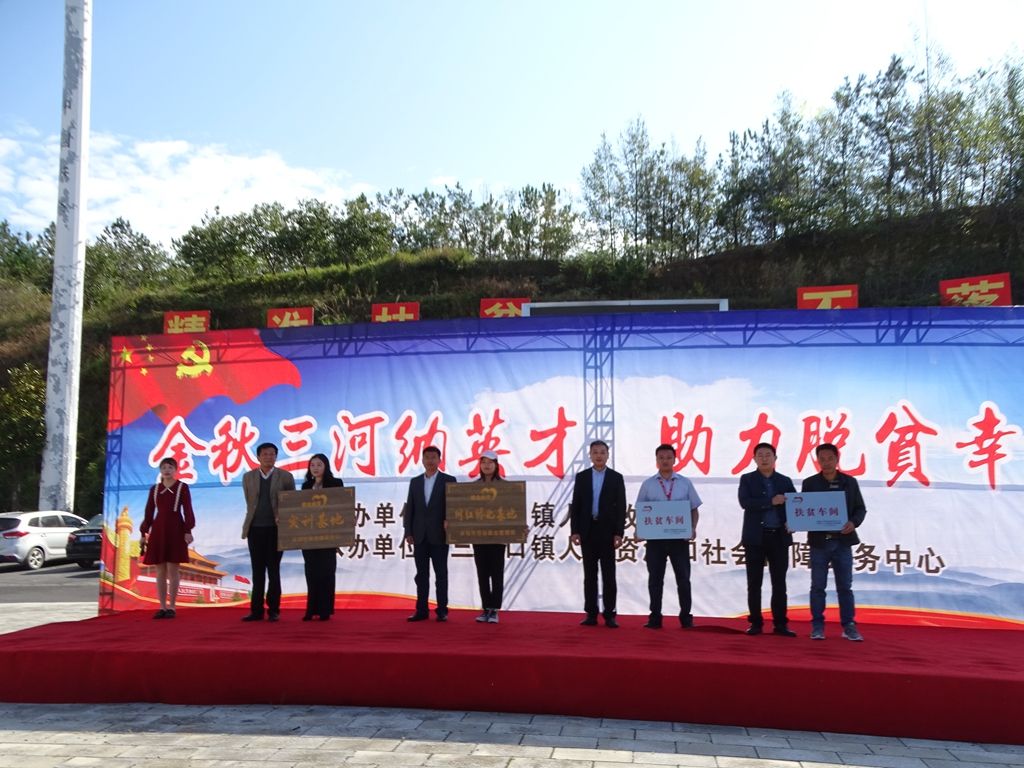 活动中,市人社局党组书记、局长李峰,市扶贫办党组成员、副主任王建军,三河口镇党委书记王四林和镇党委副书记、镇长凌卫华分别为润升电子厂、千菌谷食用菌基地、锦绣三河文化创业园等企业代表授予“实训基地”、“扶贫车间”牌匾,表彰企业在积极参与脱贫攻坚、服务当地经济的榜样作用。