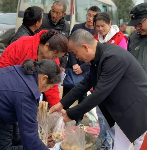 赶集现场,肖家咀村民们站在自家摊位前,向过往的人们销售推介自家土鸡、土鸭以及蛋、米、蔬菜等农副产品,吸引众多人前来赶集。公安县“日行一善”陈东山基金会理事长、深圳市东山防水科技股份有限公司董事长陈东山带着20多名基金会会员前来赶集,捐赠肖家咀村扶贫款5万元,并自掏腰包购买贫困群众农产品,现场农副产品很快销售一空。