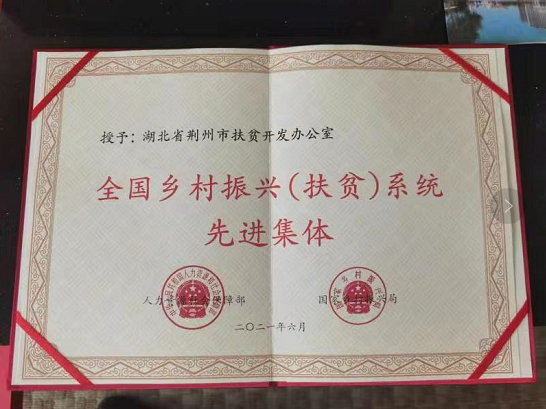 6月8日,全国乡村振兴(扶贫)系统先进集体先进个人表彰大会在京召开。会上,原荆州市扶贫开发办公室被人力资源和社会保障部、国家乡村振兴局授予“全国乡村振兴(扶贫)系统先进集体”光荣称号。