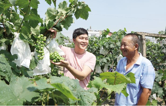 6月30日,天门市渔薪镇蔡庙村村干部邓科敏为5组村民吴树发讲解葡萄后期管理技术。该村以“两委”干部为主体成立田园丰农机服务专业合作社,开展土地整村流转,同时制定产业发展规划,推动形成了1500亩虾稻、200亩中药材、600亩红高粱的经济作物产业和100亩葡萄采摘园、100亩垂钓园的休闲旅游产业,在增加集体收入的同时,带领群众致富。