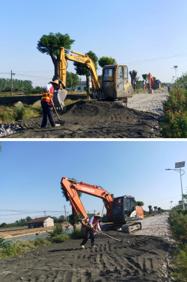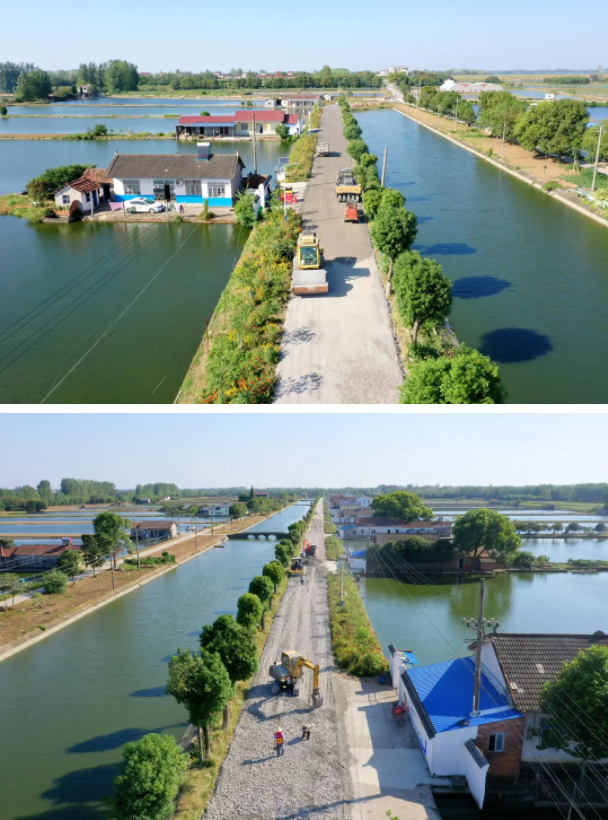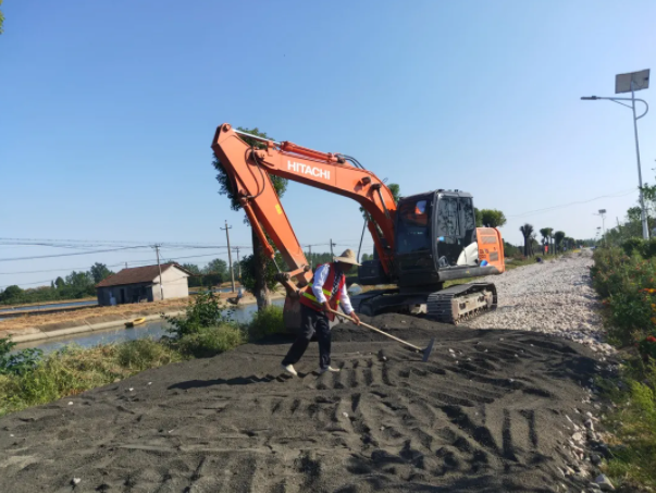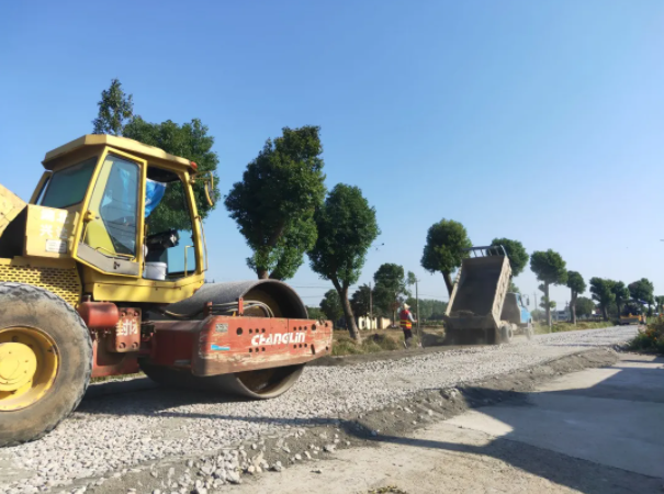 在荆州区张家山、菱角湖、丁家咀连湖旅游公路改建工程一标段现场记者看到,施工人员正在抢抓晴好天气进行路面大粒径的铺筑,即将进行路面刷黑。