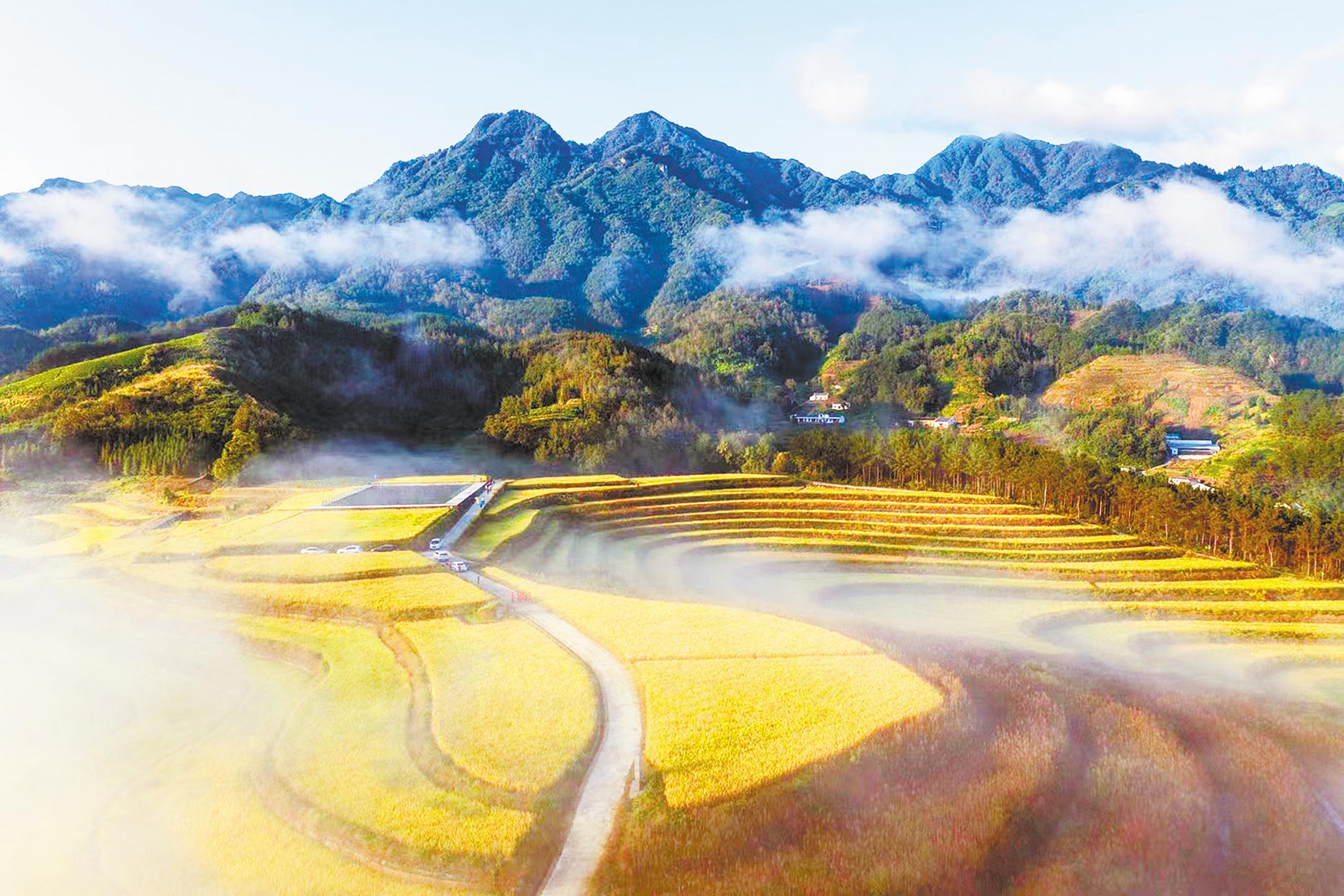 竹溪县中峰镇旱改水项目,金黄的梯田与青山绿水相映,构成一幅山水画卷(资料照片)。(通讯员 帅云 摄)