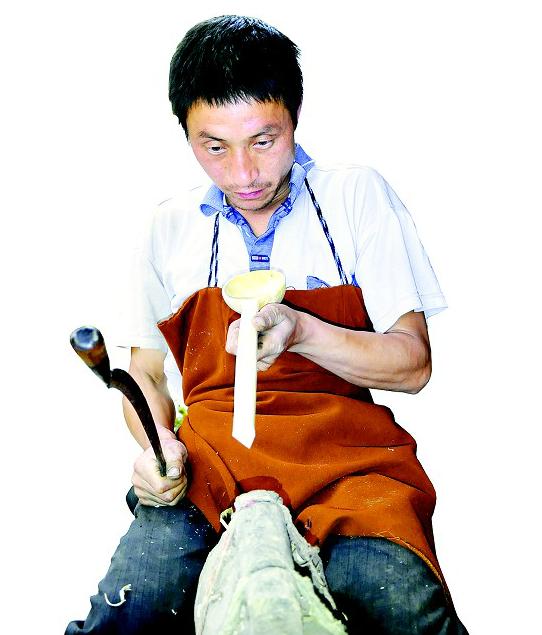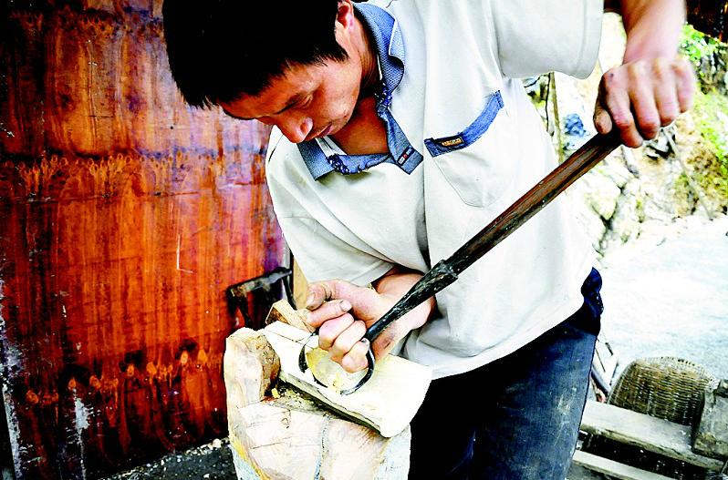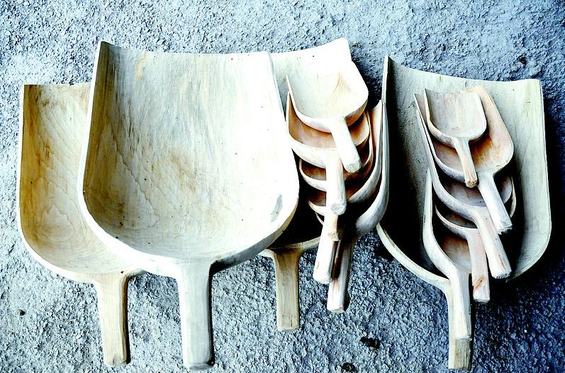 恩施市红土乡大岩村黄家台组的木匠,充分利用当柴烧的杂木,按照不同的部位,手工雕刻成各种各样的厨具,表面不上漆,木质纹理细腻通达,造型美观,受到消费者青睐,远销武汉等地。