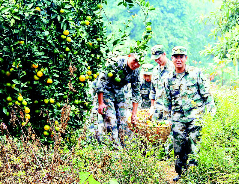 湖北日报讯 昨日,湖北预备役高炮师三团官兵来到武穴市四望镇德里桥村陶风贵家帮忙摘橘子,并将摘好的近万斤橘子按要求包装成袋运到家中。该团积极开展“进农家心连心”活动,以实际行动践行中国梦主题。