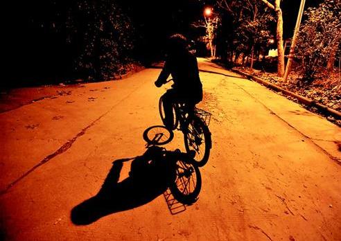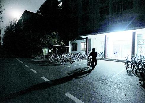 图为:忙到深夜,骑车返回已经空荡荡的校园。