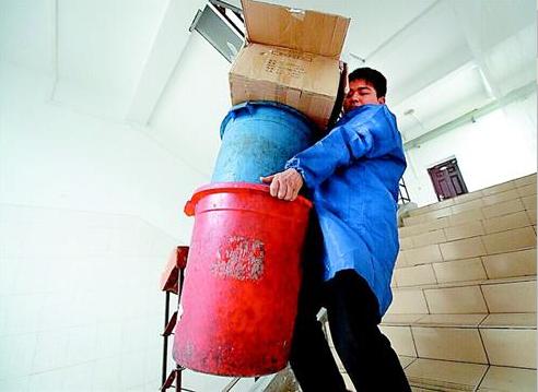 图为:清扫完宿舍楼道后,把垃圾从五楼搬下去。