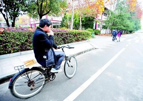 8点,他边骑车边啃着馒头赶往图书馆,准备双学位的毕业设计。他的早餐常常是赶路时吃的。