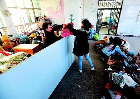 图为:午休时间,整理爱心人士捐赠的衣物。