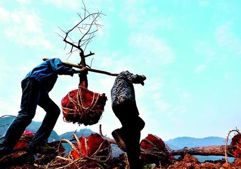 湖北日报讯 15日,竹溪县新洲移民区移民在运栽甜柿子树。该乡是潘口电站淹没区的移民区,今冬全乡栽植各类果树和观光风景树共计30000株,力争将库区建设成风景宜人,瓜果飘香的移民新区。