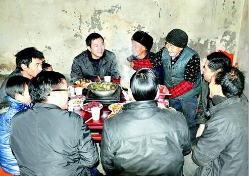 图为:巴东县委书记陈行甲(中)在穷亲戚家吃年饭。
