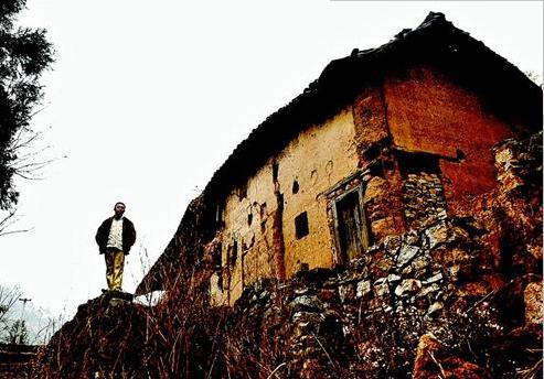 图为:2011年冬,雄娃子站在破败的屋子外。