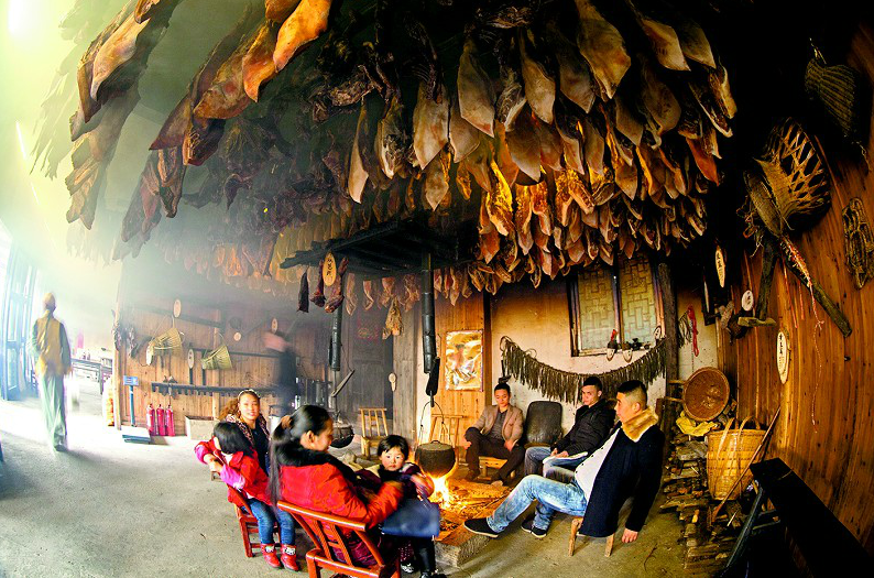 3日,游客在挂满腊肉的火塘屋里休闲。这里是恩施市女儿城一间土家火塘屋。进入冬季,就是大量烘烤腊肉对外销售的季节,目前已有北京等外地客户通过快递方式大量购买这地道的腊货,山城年味渐浓。