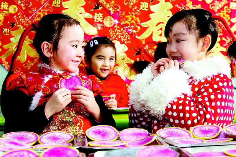 如今,在城里很少见着有人立春吃生萝卜,但在乡下,尤其是北方,立春日走在街头,你会看到不论大人孩子还是大闺女小媳妇,都在津津有味地嘎巴嘎巴地咬着脆生生的大萝卜,边咬边互相笑问:“咬住春天了没有?”“咬住了,今年的春好脆好香啊!”豁牙的老叟也在咬,他们坚信:“咬得春,活百春。”用萝卜咬春,也寓意着“咬得菜根,吃得百苦,享得百福”。(常书侦)