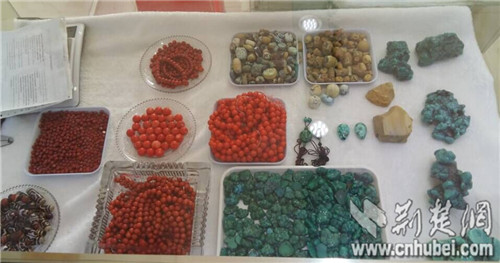 展销厅内售卖绿松石、南红、珊瑚等多种饰品