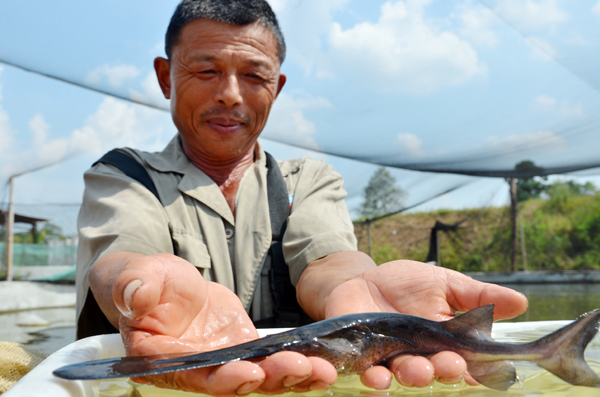 据悉,匙吻鲟原产于北美,因其嘴长像汤匙而得名,口感细嫩,味道鲜美,营养价值极高。今年以来,大悟县水产局积极筹措资金10万元,引进匙吻鲟5万尾,分别投放于玛瑙冲、姚河、尹塆三座水库进行大水面试养。目前,该鱼种成活率已达到90%以上,预计明年年初起捞,成鱼市场价75元/斤,主要销往武汉、北京等高端水产批发市场,此举成为当地农民增收致富的又一渠道。