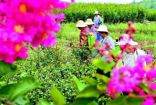 湖北日报讯 近日,嘉鱼县高铁岭镇八斗角村的村民们,忙着给花卉苗木基地的树苗除虫。高铁岭镇花卉苗木基地连片开发项目是该县最大的扶贫项目,总投资1750万元,种植面积9000亩,帮助农户通过种植收益、打工收益等致富。(记者郑元昌 视界网 龙钰 刘智 摄)