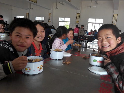 郧阳区白浪镇九年一贯制学校的留守儿童正在吃午餐