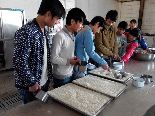郧阳区白浪镇九年一贯制学校的九年级学生正在盛饭(午餐)
