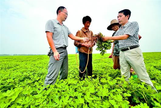 湖北日报讯 近日,襄阳市襄州区峪山镇金寨村,农技人员与村民一道查看花生长势。今年,襄州推广特色产业扶贫,引进的花生用农机起垄种植模式以省工省时、高产优质深受农户欢迎,峪山镇在鄂北岗地种植5万亩旱地花生,今年预计为农民增收500多万元。(记者刘曙松 视界网 潘辉 摄)