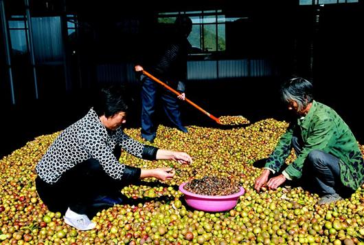 3日,竹山县荣华油茶专业合作社负责人谭绍荣组织劳力晾晒油茶鲜果。