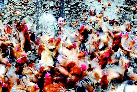 湖北日报讯 21日,闻俊在用玉米喂养生态鸡。南漳县九集镇石门集四组的小伙子闻俊于今年初结束了在外打工生涯,回到老家办起生态养鸡场,首批投放3000多只小鸡在山上散养。他希望用3年时间将养殖规模扩大到5万只。 (视界网 熊明银 摄)