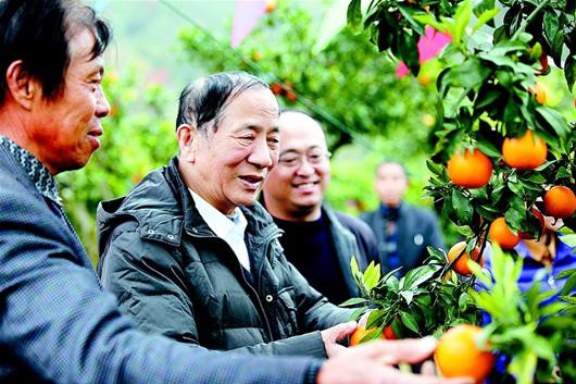 湖北日报讯 20日,全国劳动模范、全国道德模范吴天祥来到钟祥市张集镇张畈村柑橘品改帮扶基地,了解生产情况。从2012年开始,吴天祥先后多次联系华农大教授帮扶当地橘农解决品种改良等技术难题,帮助乡亲们走上致富之路。 (视界网 钟国庆 摄)