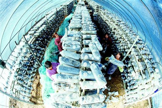 湖北日报讯 26日,竹山县深河乡双湾村村民在食用菌大棚里管理食用菌菌筒。双湾村是移民村,土地少,后续发展难。当地政府在政策、资金上给予倾斜支持,按照“工厂化、规模化、基地化”思路,实施公司龙头带动,合作社推动,扶持食用菌基地建设,增加移民收入。