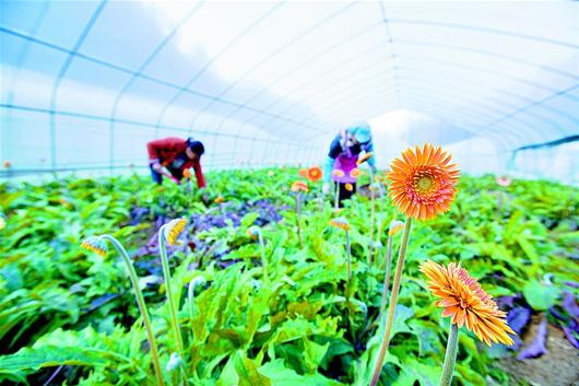 湖北日报讯 18日,竹山县文峰乡太和村农民陈运芬在种有非洲菊的花卉大棚里除草。陈运芬是该县养花最早的农民,现种有4棚各类鲜花,年销售收入8万多元。竹山在精准扶贫中出台多项优惠政策,加快特色产业建设,鼓励农民广种花卉苗木。目前,该县花卉苗木规模达5700余亩,多种花卉苗木销往襄阳、武汉、西安等地。(视界网 章磊 摄)