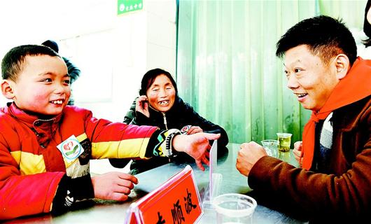 湖北日报讯 20日,爱心人士李小喜(右)与帮扶对象李顺波谈笑风生。当日,襄阳市“一对一”帮扶贫困生的爱心人士来到南漳县李庙镇中心学校,与27名贫困生进行对接帮扶并签订了对接书,资助他们完成从小学到大学的学业。 (视界网 熊明银 摄)