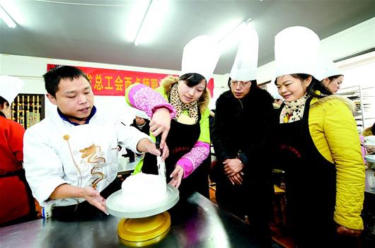 湖北日报讯 昨日,学员在武汉一家西式面点培训点接受培训。省总工会为湖北籍下岗职工、未就业大学生等困难群体,免费提供中西式面点、咖啡奶茶师等5种技能培训,帮助他们提升就业和创业技能。今年以来省总工会累计为近2000名困难群众进行了免费培训。(记者张朋 视界网 李春梅 摄)