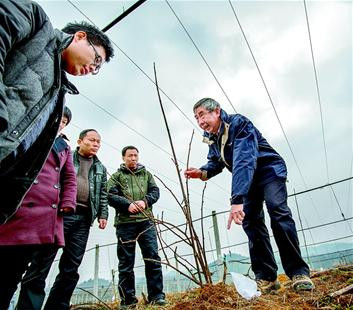 图为:湘西土家族苗族自治州花垣县排碧乡十八洞村猕猴桃基地,中国园艺学会猕猴桃分会理事长黄宏文(右一)给村民讲解猕猴桃嫁接注意事项。