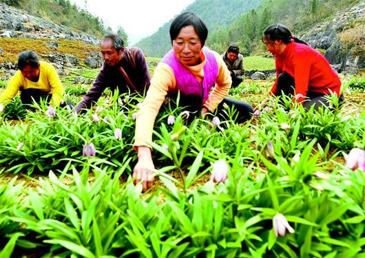 湖北日报讯 13日,建始县花坪镇周塘村5组药农在贝母地里锄草。花坪镇是湖北贝母的发源地之一,近年来,该镇恢复性发展这一药材,不少贫困户争相种植。 (视界网 刘波 摄)