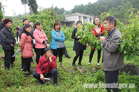 4月26日,在白杨坪镇董家店村大竹园黄金梨种植基地里,恩施市农业局技术专家正在为当地梨农进行黄金梨种植管理技术的讲解培训。