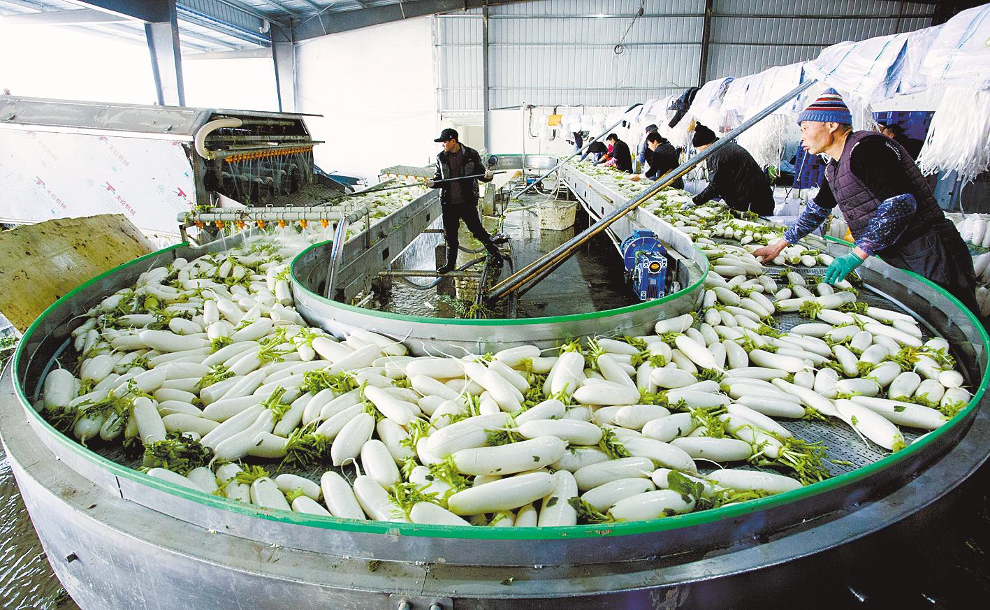 天门市多宝镇张李村苗苗蔬菜种植专业合作社里,20多名工人将一根根沾着泥巴的萝卜洗涤、去叶、分拣、包装,一整套工序后,泥萝卜变得白净水灵。