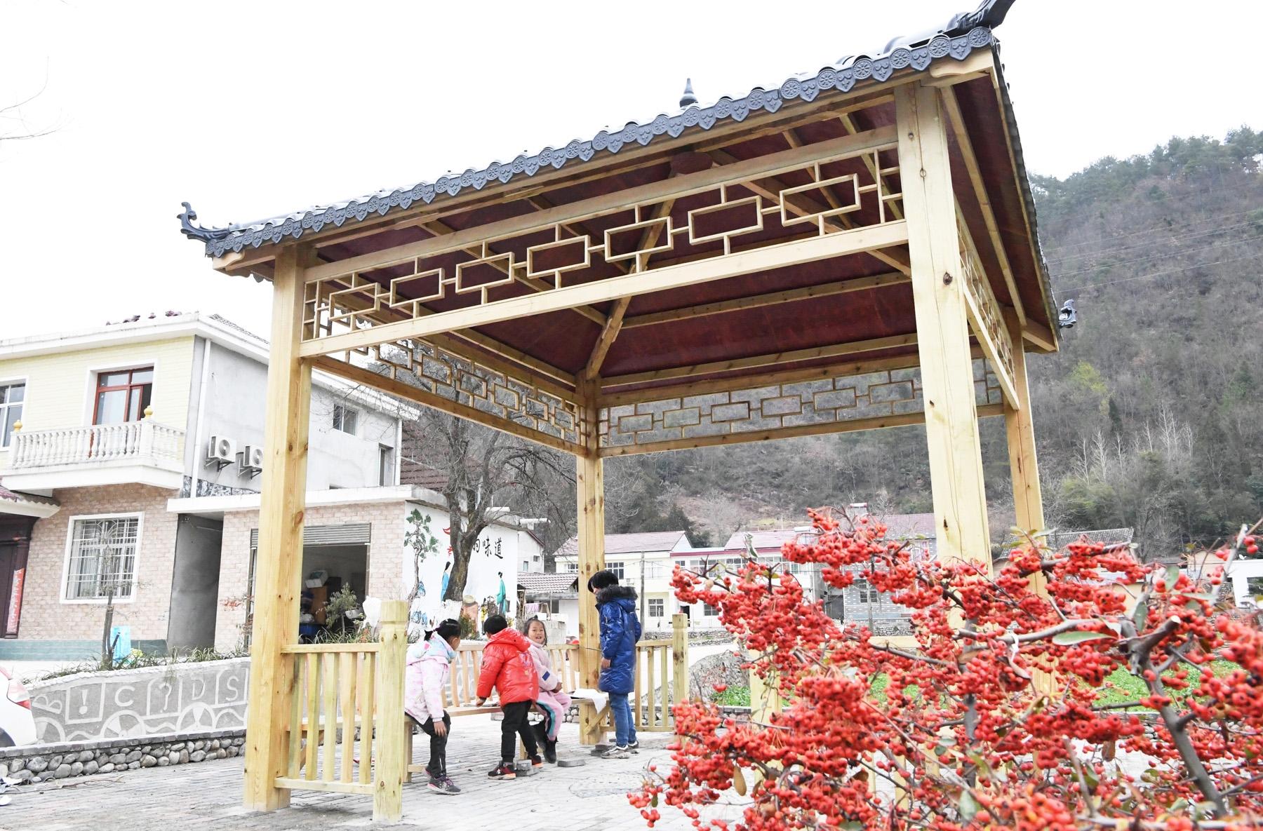 近年来,保康县马良镇宋家湾村通过村庄环境综合治理,处处干净整洁,乡村面貌焕然一新,呈现出一派美丽的田园风光。图为小孩在宋家湾村的观柳亭前玩耍。(农村新报通讯员陈泉霖 摄)