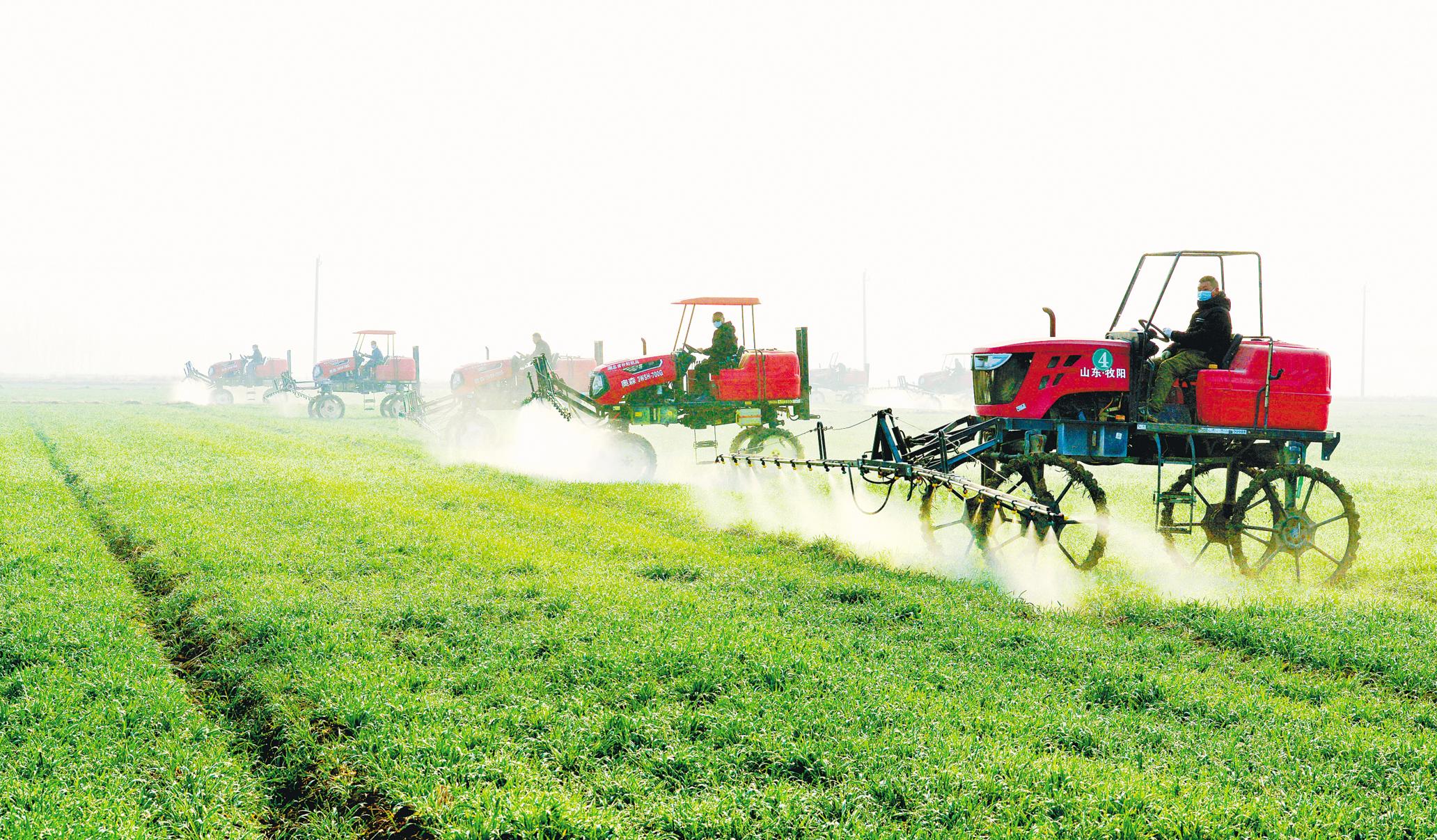 2月23日,襄阳市襄州区张家集镇现代农业示范区,农民抢抓农时,利用大型植保机和无人机等设备对小麦进行喷药管护,确保小麦长势,为夏粮稳产增产打下基础。 襄阳市是全国十大夏粮主产区,目前小麦长势良好。(视界网 安富斌 摄)