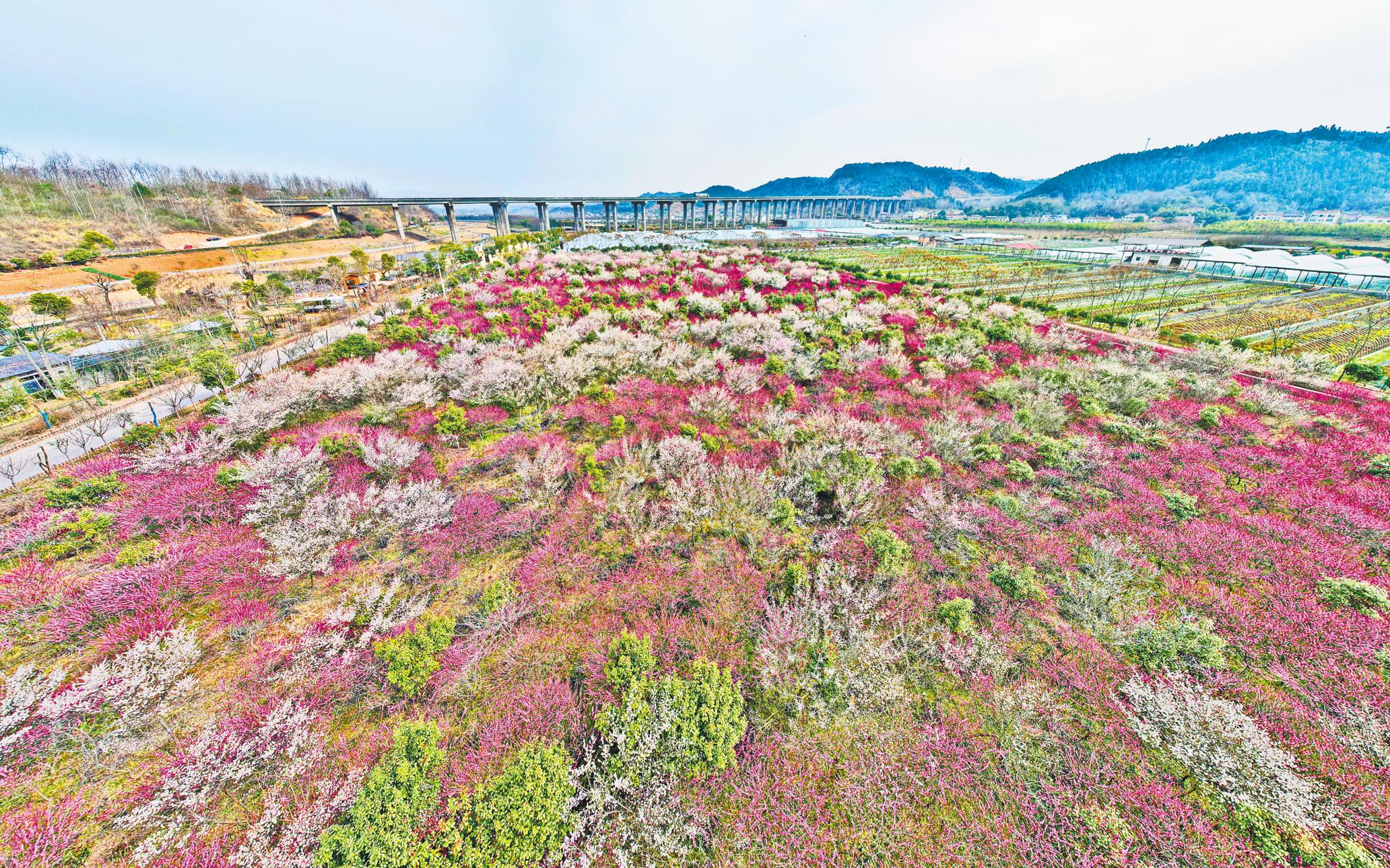3月1日,随着气温回升,宜昌市夷陵区龙泉镇青龙村田间地头套种的樱桃花、红梅花竞相绽放,宛如铺在大地上的彩色锦缎,美不胜收。近年来,青龙村以现代观光农业、本土民俗文化等资源为载体,推进农旅融合、文旅融合,被命名为“中国最美休闲乡村”。