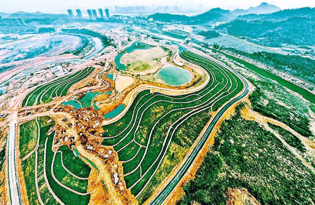 2月28日,正在修复的宜昌市卷桥河湿地鸟瞰。昔日河床滩涂裸露、污水横溢的卷桥河展现盎然春意。