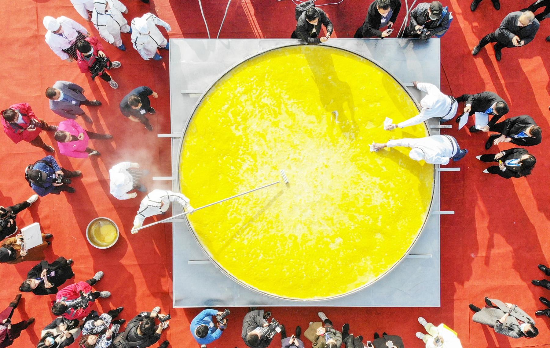3月23日,世界最大鱼糕在江陵县出锅,世界纪录认证机构WRCA工作人员现场认证并颁发证书。该鱼糕直径4.28米,面积14.4平方米,重1300多斤,由10名师傅历经数小时精心制成。(农村新报全媒记者 黄志刚 马天意 通讯员 陈清扬 摄)